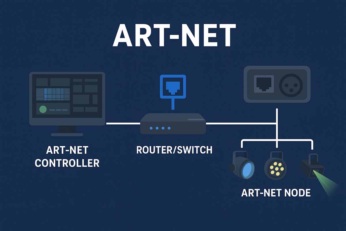 Art-Net là một giao thức truyền tín hiệu ánh sáng dựa trên mạng Ethernet (LAN), được phát triển bởi công ty Artistic Licence. Art-Net cho phép truyền dữ liệu DMX512 qua mạng IP, giúp điều khiển số lượng lớn thiết bị ánh sáng và hiệu ứng trên sân khấu một cách linh hoạt, tốc độ cao và ổn định.