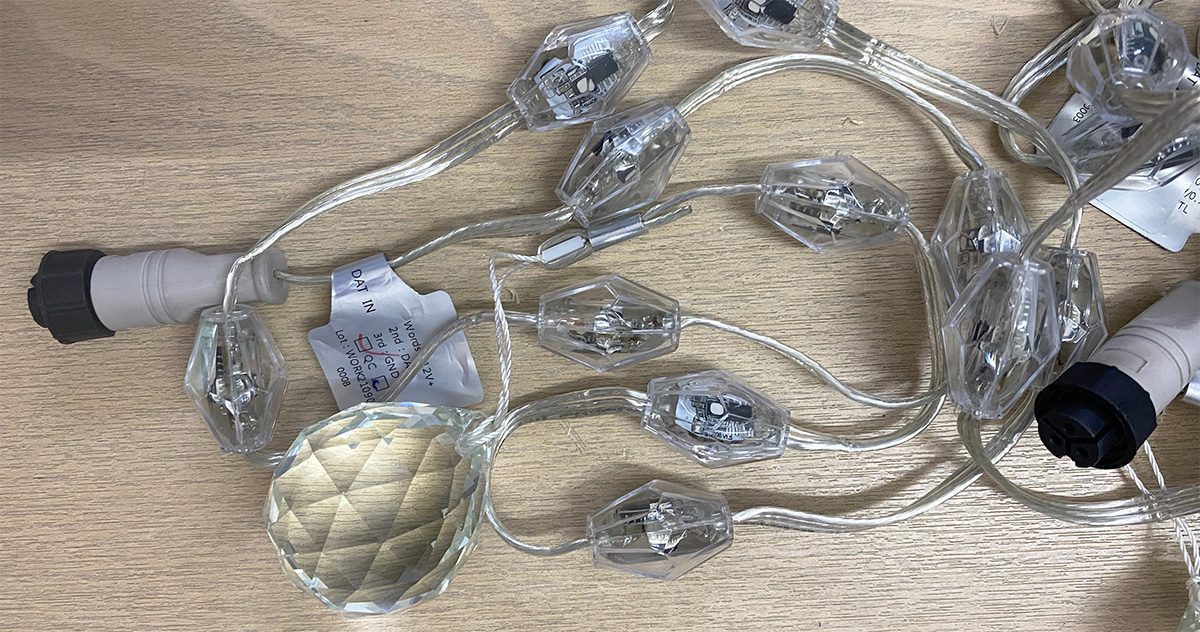 - Cuối mỗi sợi LED có quả cầu bằng pha lê, để phản xạ ánh sáng và tạo lực căng cho dây đèn.