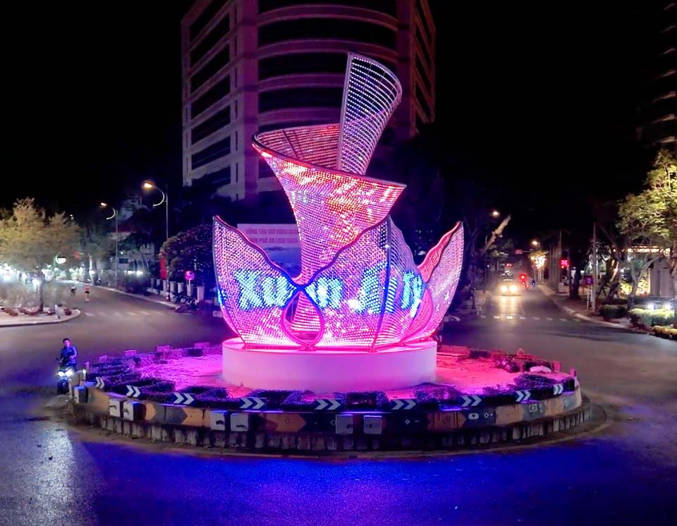 Vòng xoay Trần Hưng Đạo – Lê Lợi nay trở thành điểm nhấn nghệ thuật ánh sáng độc đáo của thành phố. Với thiết kế cách điệu từ 5 cánh sóng vươn cao bao quanh khối trung tâm lấy cảm hứng từ ngọn Hải Đăng, công trình vừa gợi hình ảnh biển cả, vừa biểu trưng cho khát vọng vươn xa và sự thịnh vượng. Hệ thống đèn LED tiết kiệm năng lượng kết hợp điều khiển thông minh 4G/5G tạo nên những màn trình diễn ánh sáng lung linh, biến không gian giao thông trung tâm thành biểu tượng hiện đại, sống động về đêm.