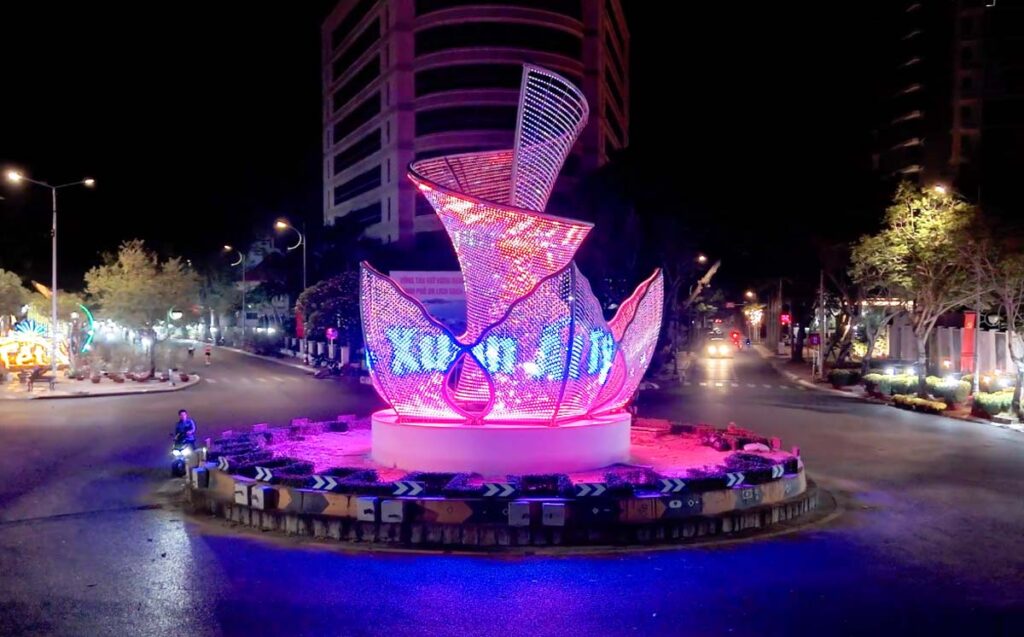 Vòng xoay Trần Hưng Đạo – Lê Lợi nay trở thành điểm nhấn nghệ thuật ánh sáng độc đáo của thành phố. Với thiết kế cách điệu từ 5 cánh sóng vươn cao bao quanh khối trung tâm lấy cảm hứng từ ngọn Hải Đăng, công trình vừa gợi hình ảnh biển cả, vừa biểu trưng cho khát vọng vươn xa và sự thịnh vượng. Hệ thống đèn LED tiết kiệm năng lượng kết hợp điều khiển thông minh 4G/5G tạo nên những màn trình diễn ánh sáng lung linh, biến không gian giao thông trung tâm thành biểu tượng hiện đại, sống động về đêm.