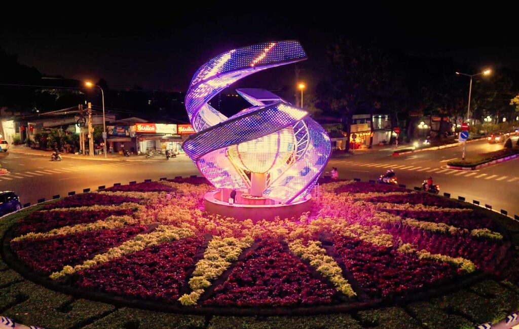 Biểu tượng trang trí kết cấu thép kết hợp chiếu sáng mỹ thuật tại vòng xoay Paradise là điểm nhấn nghệ thuật mới của thành phố. Với thiết kế cách điệu từ hình ảnh ba dòng nước ôm trọn viên ngọc quý, công trình mang ý nghĩa gắn kết và phát triển bền vững. Hệ thống đèn LED hiện đại kết hợp điều khiển DMX tạo hiệu ứng ánh sáng sống động, biến không gian giao lộ Nguyễn An Ninh – đường 3/2 thành bức tranh rực rỡ về đêm, vừa nâng tầm mỹ quan đô thị vừa thu hút du khách.